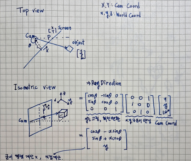 여기에는 2개의 좌표계가 공존하고 있다. 하나는 카메라좌표계, 나머지 하나는 미로의 좌표계(world coordinate)이다. 따라서 나는 카메라 좌표계를 먼저 미로 좌표계로 변환한 후 나머지 계산을 진행했다.