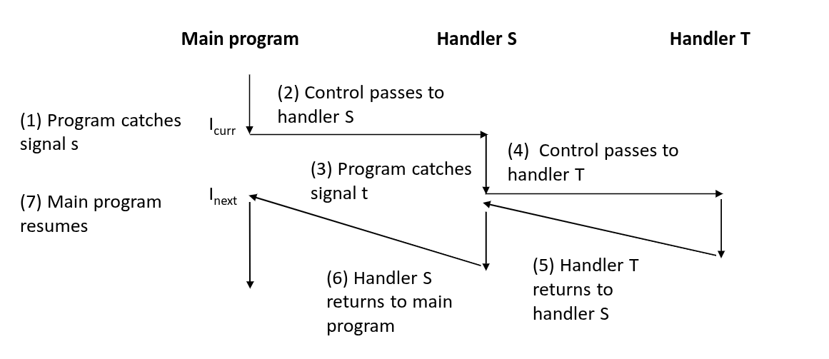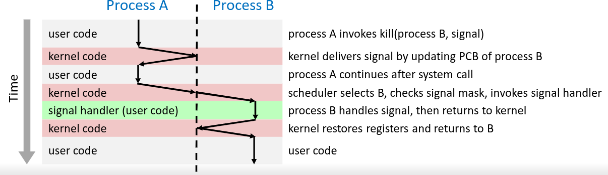 | Handling | Processor, vector table -> handler | OS kernel, per-process signal handlers |