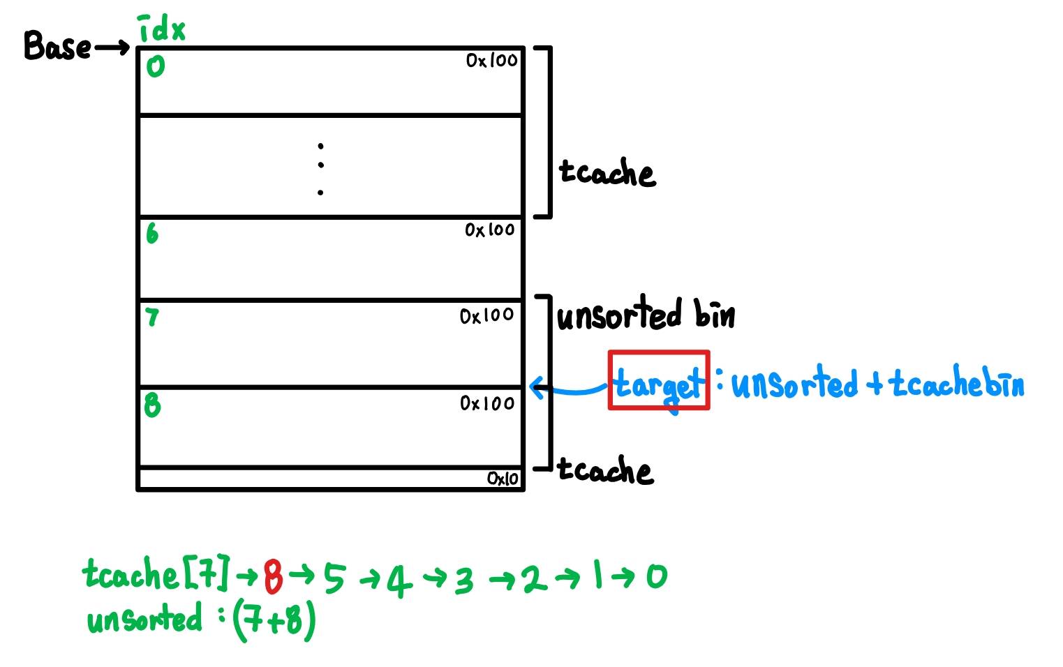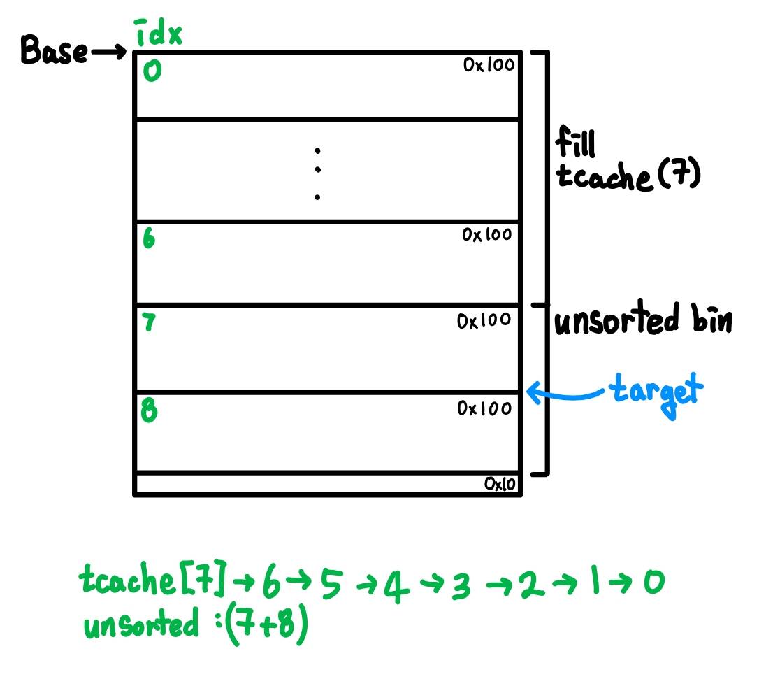 - tcache ๋ชจ๋ ์ฑ์ฐ๊ธฐ, ํฌ๊ธฐ๋ fastbin ํฌ๊ธฐ๋ฅผ ์ด๊ณผํ๋๋ก. e.g. 0x100